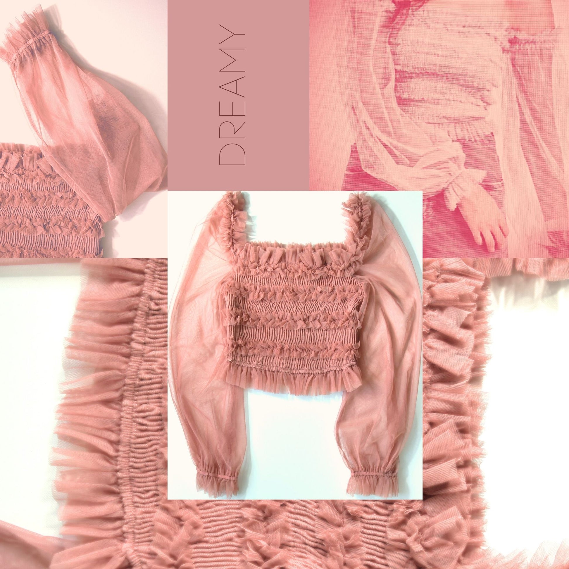 Feel the dreamy romance in this crop top, with its tulle ruffle-smocked rose puff sleeves, designed to be worn on or off the shoulders for a versatile, enchanting look.