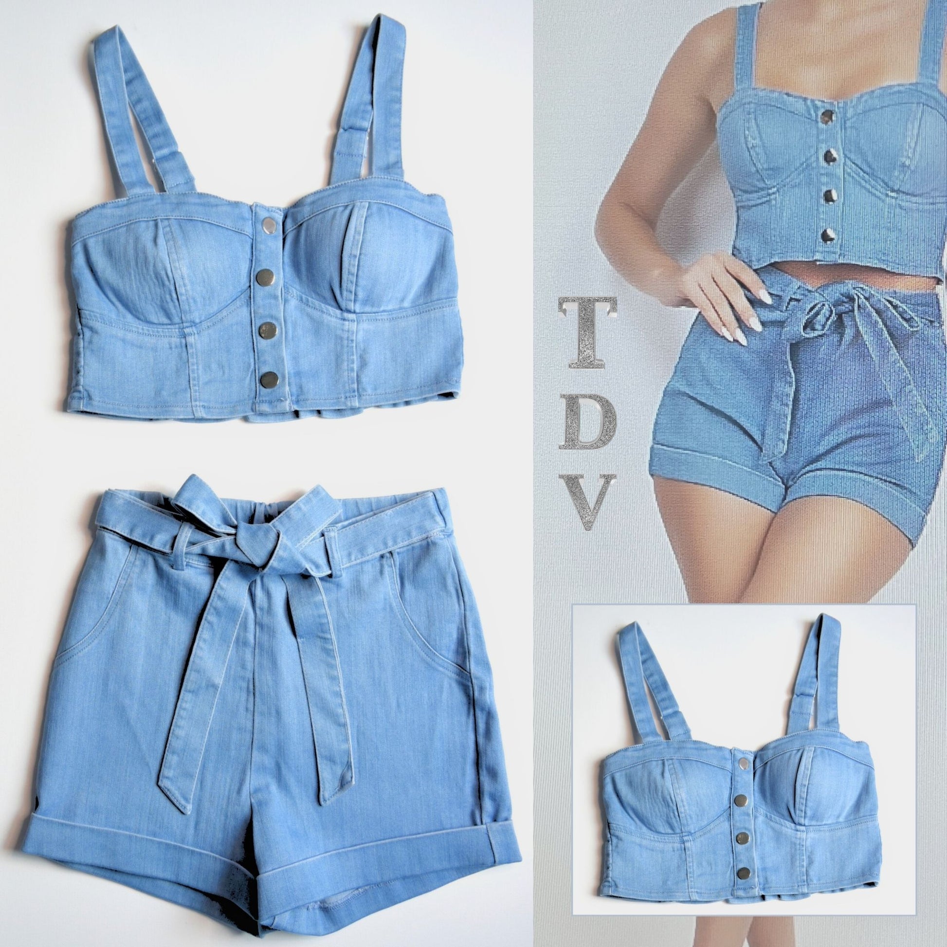 Stretchy denim delight! This playful short set features a front-button top and a cute lace-up belt—ready for anything!