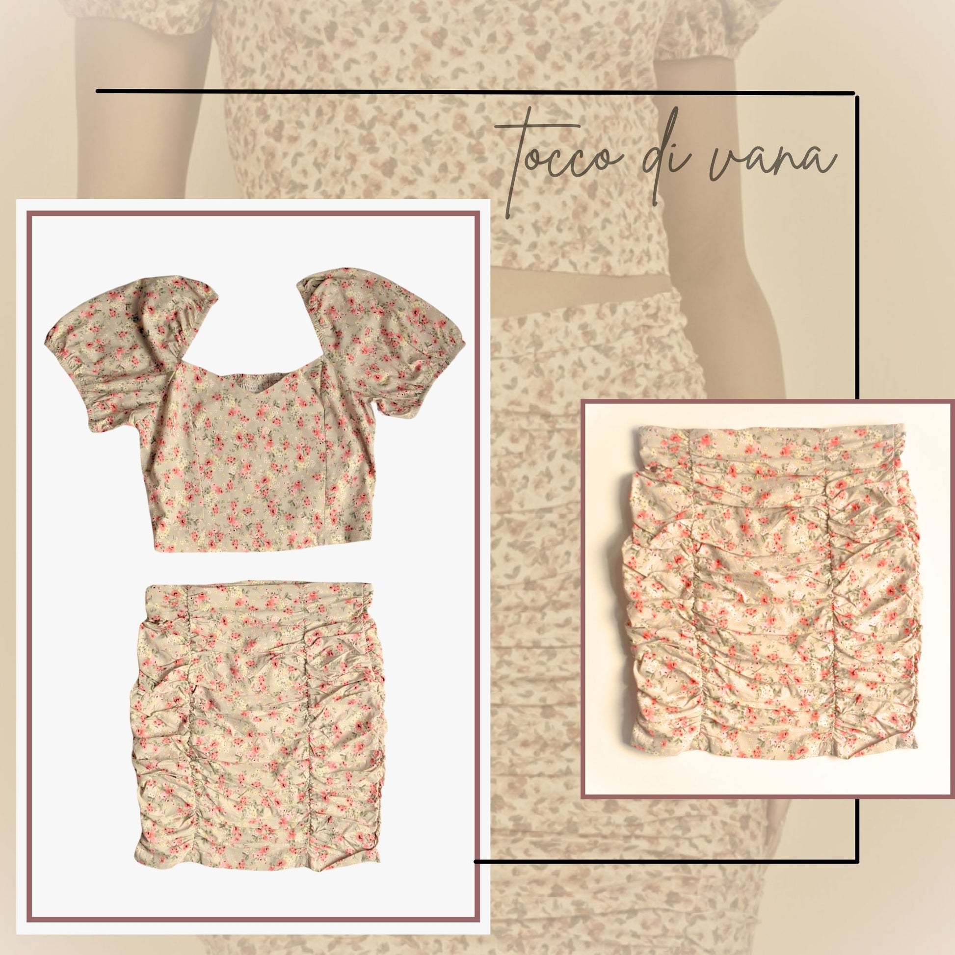 Floral woven crop top with puff sleeves, sweetheart neckline, and shirred back. Matching high-waist mini skirt with shirred detail and super spandex stretch.