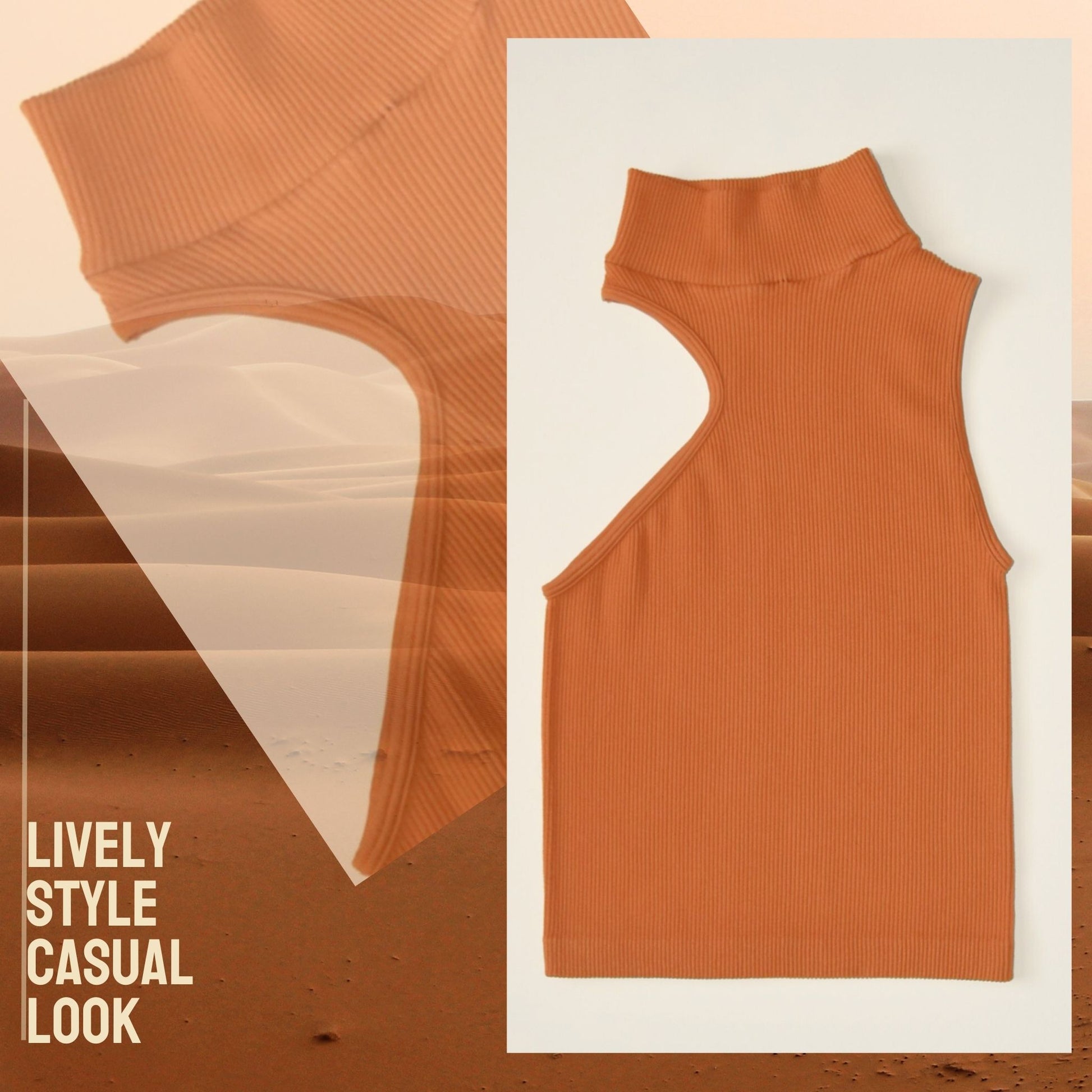 A lively casual look with a copper one-shoulder crop top and energetic colors blends boldness and comfort, perfect for standing out.