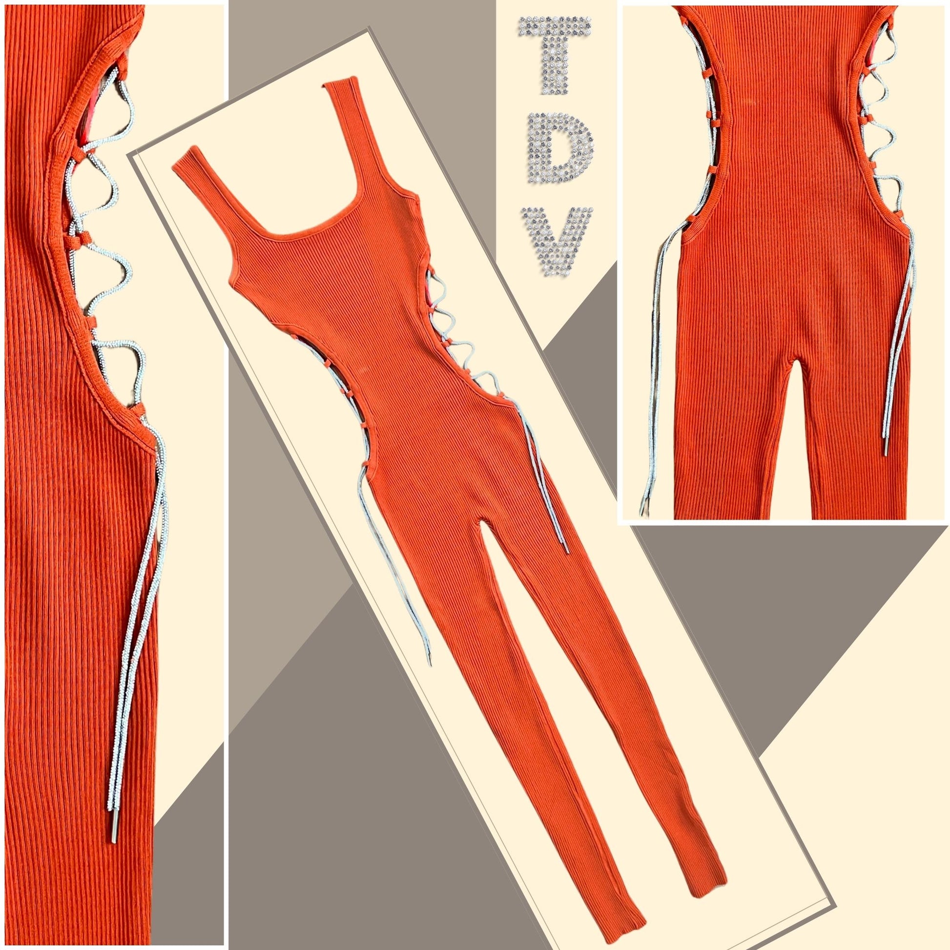 Rust-colored slim-fit jumpsuit with rhinestone lace-up side cutouts—playful and chic!